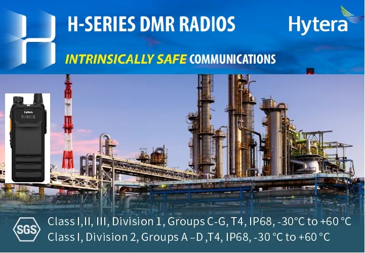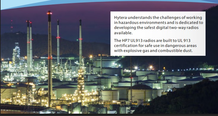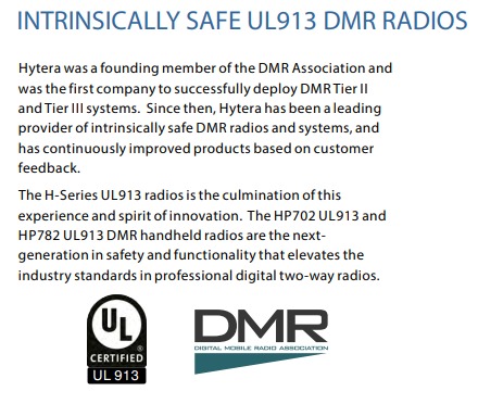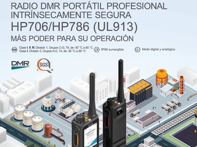 La radio de seguridad intrínseca de Hytera HP706 UL913 está diseñada según los requisitos de las normas UL913 de EE. UU., CSA de Canadá y TIA4950, es capaz de funcionar en entornos peligrosos con gases explosivos y partículas de polvo.