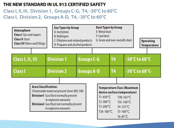 Class I, II, III, Division 1, Groups C-G, T4, -30°C to 60°C Class I, Division 2, Groups A-D, T4, -30°C to 60°C