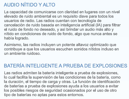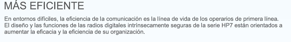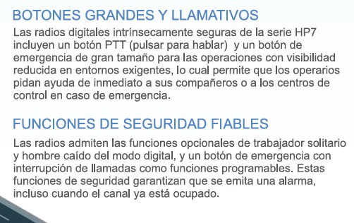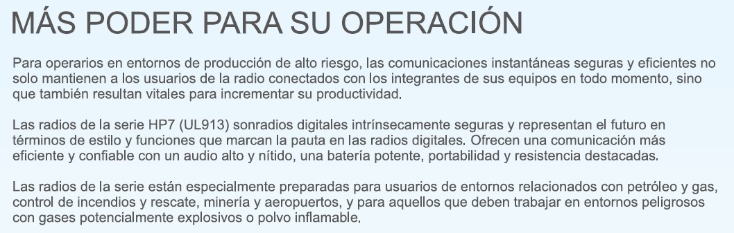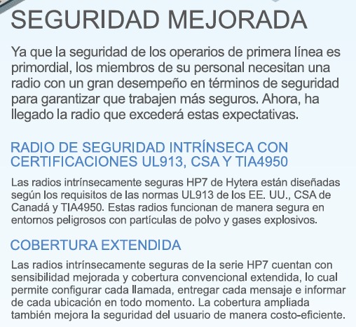 Para los trabajadores que trabajan en entornos de alto riesgo, las comunicaciones instantáneas seguras y eficientes no solo mantienen a los usuarios de radio conectados con los miembros de su equipo en todo momento, sino que también son vitales para aumentar su productividad. HP706 UL913 es nuestra nueva radio digital intrínsecamente segura. Está especialmente preparada para usuarios involucrados en petróleo y gas, incendios y rescate, minería y aeropuertos, aquellos que necesitan trabajar en atmósferas explosivas o inflamables.