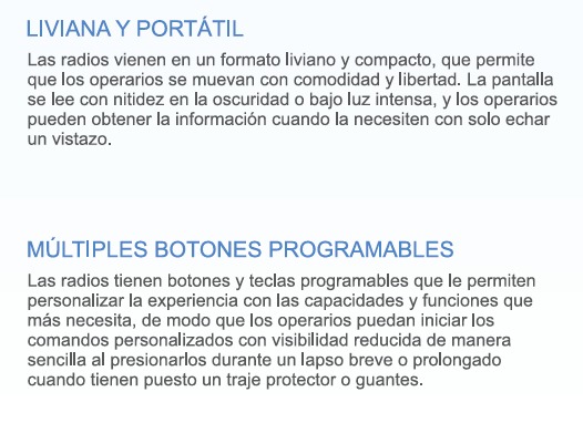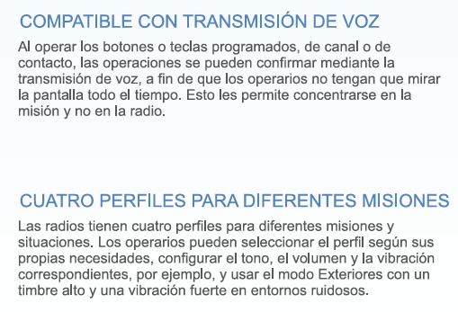La radio permite Trabajador Solitario, Hombre caído y Botón de Emergencia como funciones programables, en estos casos las llamadas serán interrumpidas, garantizando que una alarma se active, incluso cuando los canales están ocupados.